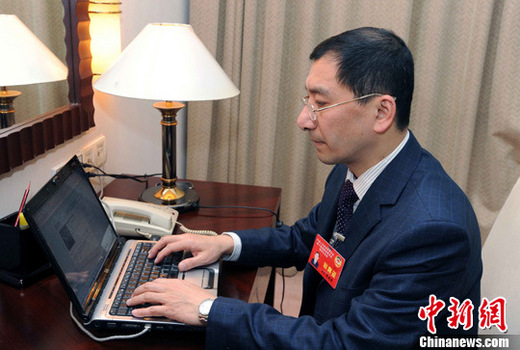 1月11日,福建省政協(xié)委員侯建明利用參會間隙在駐地賓館房間,通過上網(wǎng)用微博與民眾就普遍關(guān)心的熱點(diǎn)民生等問題進(jìn)行互動(dòng)交流。當(dāng)日,福建省政協(xié)十屆四次會議在福州開幕。(圖為資料圖)中新社記者 劉可耕 攝