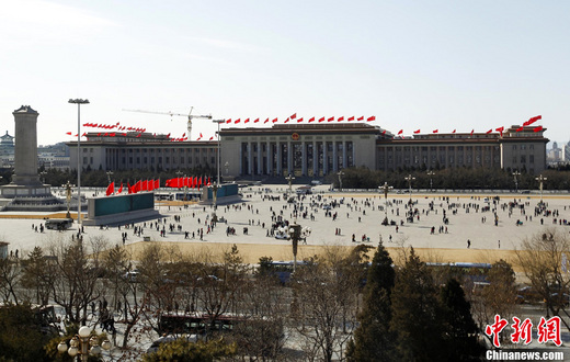 全國(guó)兩會(huì)召開在即,人民大會(huì)堂東門外的廣場(chǎng)上紅旗招展。中新社發(fā) 廖攀 攝