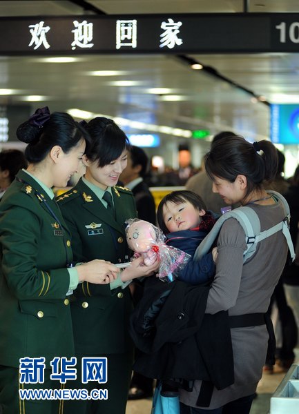 3月16日,邊檢人員歡迎小寶寶回家,并送給寶寶禮物。當(dāng)日,從日本撤離回國(guó)的1900余名中國(guó)公民陸續(xù)抵達(dá)大連周水子國(guó)際機(jī)場(chǎng)。大連周水子機(jī)場(chǎng)邊檢站啟動(dòng)應(yīng)急預(yù)案24小時(shí)備勤,開(kāi)通日本歸國(guó)公民入境特別通道,為其快捷通關(guān)與親人團(tuán)聚提供便利。大連是中國(guó)東北地區(qū)通航日本的重要門戶。日本大地震后至3月16日,共有4000余名中國(guó)公民從日本入境大連回國(guó)。新華社發(fā)(李雨澤)