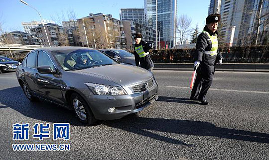 2月24日,交警在北京三元橋附近攔截一部沒有上牌的車。當天,北京交管部門開展對涉牌違法車、霸王車的專項整治。此次專項整治是北京市“文明交通行動”的重要內容之一。李文 攝