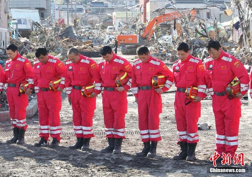 3月18日下午,日本民眾為一周前大地震中6000多名遇難者舉行默哀儀式,所有避難所和救援人員都停止作業(yè),為死難者哀悼。圖為在巖手縣大船渡災(zāi)區(qū),中國國際救援隊向日本地震遇難者默哀。