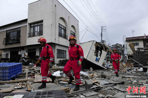 3月15日下午,幾天前抵達日本巖手縣大船渡市的中國國際救援隊隊員在進行搜救。大船渡市緊鄰海港,是此次日本大地震中受災(zāi)最嚴(yán)重的地區(qū)之一。中新社發(fā) 侯宇 攝
