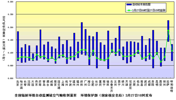 上圖是環(huán)境保護(hù)部(國(guó)家核安全局)3月27日18時(shí)繼續(xù)發(fā)布的全國(guó)省會(huì)城市和部分地級(jí)市輻射環(huán)境自動(dòng)監(jiān)測(cè)站實(shí)時(shí)連續(xù)空氣吸收劑量率監(jiān)測(cè)值。監(jiān)測(cè)結(jié)果匯總圖中綠色曲線代表監(jiān)測(cè)值,藍(lán)色柱體代表天然本底水平,綠色曲線均在藍(lán)色柱體范圍內(nèi)。監(jiān)測(cè)結(jié)果表明,目前我國(guó)環(huán)境輻射水平仍在本底范圍內(nèi),日本核電事故未對(duì)我國(guó)環(huán)境及境內(nèi)公眾健康產(chǎn)生影響。