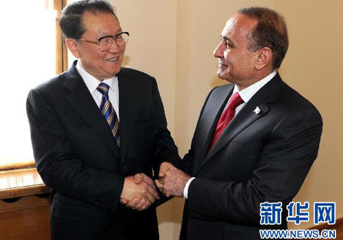 當地時間4月12日,中共中央政治局常委李長春在埃里溫會見亞美尼亞議長奧維克·阿布拉米揚。 新華社記者 馬占成 攝