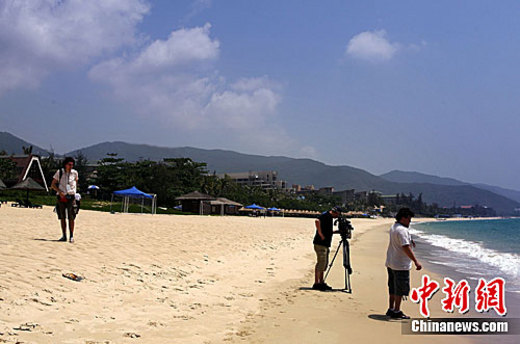 4月13日,隨同俄羅斯總統梅德韋杰夫到中國海南省三亞出席“金磚峰會”的俄羅斯記者在風景如畫的亞龍灣海濱拍攝外景。金磚國家領導人第三次會晤將于14日在這里舉行,中國國家主席胡錦濤與巴西、俄羅斯、印度以及南非的國家領導人將出席。中新社發 任晨鳴 攝