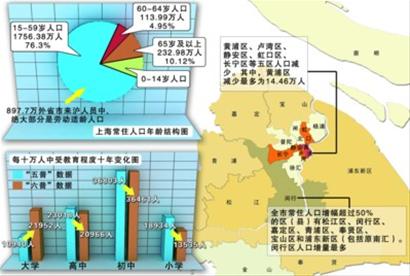 上海統計局昨天(3日)公布的上海市第六次全國人口普查數據顯示,以2010年11月1日零點為標準時點,全市常住人口為2301.91萬人,而上海 “十一五”規劃是“到2010年全市常住人口規模預計為1900萬人左右”。與2000年第五次人口普查(以下簡稱“五普”)相比,共增加628.14萬人,增長37.53%,平均每年增加62.81萬人,年平均增長率為3.24%。