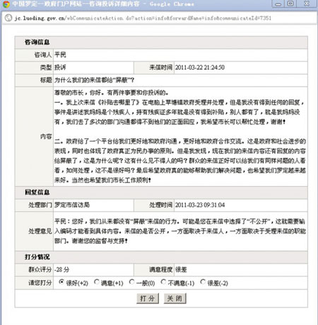 “羅定市行政電子監(jiān)察大廳”運行4年來,收到群眾來信近5000條,一度名聲在外。剛開始運行時,市民反映的問題和答復(fù),任何人都可以看到,現(xiàn)在卻有不少答復(fù)說:“您所提交的信訪件,已處理完畢,由于不便公開,我們將通過電話或郵件的方式回復(fù)您,或者您可以通過下方的業(yè)務(wù)編碼查詢查看處理結(jié)果。”