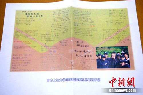 “上智大學的同學們:收到你們精心設計,充滿深情的別致來信,心里感到非常高興。你們樸實的語言和照片上的笑臉,讓我想起和你們一起打棒球的歡快情景。我很想念你們!”這是溫家寶總理5月5日在中南海寫下的親筆回信,信箋左上角印著溫總理身穿運動服與上智大學棒球隊隊員們的合影。