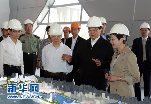 6月30日,國(guó)家主席胡錦濤在香港視察啟德發(fā)展計(jì)劃。這是胡錦濤主席在聽(tīng)取關(guān)于項(xiàng)目建設(shè)的介紹。 新華社記者 鞠鵬 攝