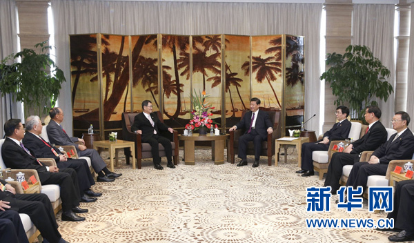 4月8日,中共中央總書記習近平在海南省博鰲會見臺灣兩岸共同市場基金會榮譽董事長蕭萬長一行。 新華社記者 龐興雷 攝
