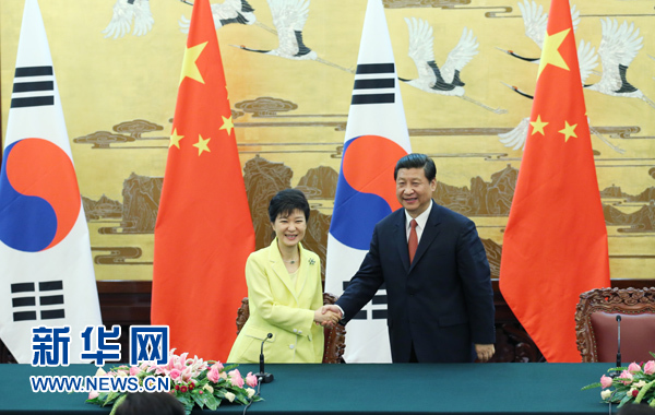 國家主席習近平27日在人民大會堂同韓國總統樸槿惠舉行會談。兩國元首就發展中韓戰略合作伙伴關系、加強在朝鮮半島局勢等重大國際和地區問題上的合作深入交換意見,達成廣泛共識。