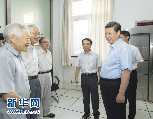 7月17日,中共中央總書記、國家主席、中央軍委主席習近平到中國科學院考察工作。這是習近平同當年參與北京正負電子對撞機建設和應用的3位院士交談。新華社記者 李學仁 攝