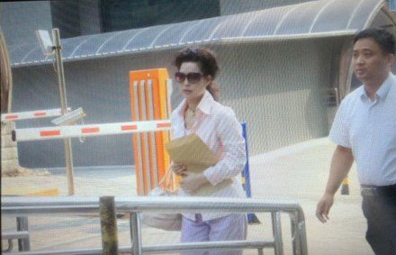 夢鴿穿著一件粉色上衣、戴著大墨鏡出現在海淀法院南門