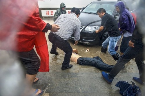 10月7日,杭州,在下沙七格段,受“菲特”影響,錢塘潮威力大增。在觀潮人群中,有一人被潮水卷入車底,臉部受傷,多名觀潮者出手相助,及時把傷者送到醫(yī)院。攝影:李華春