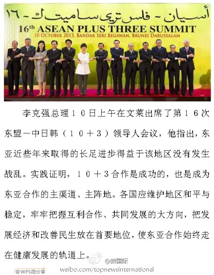 據新華社“新國際”微博報道,李克強總理10日上午在文萊出席了第16次東盟-中日韓(10+3)領導人會議。他指出,東亞近些年來取得的長足進步得益于該地區沒有發生戰亂。實踐證明,10+3合作是成功的,也是成為東亞合作的主渠道、主陣地。詳見長微博。