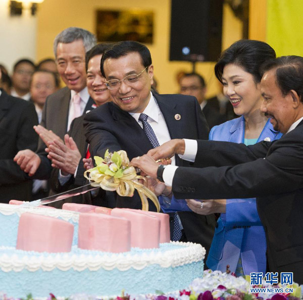 資料圖片:10月9日,李克強(qiáng)在文萊首都斯里巴加灣市出席第16次中國-東盟(10+1)領(lǐng)導(dǎo)人會議。這是會議開幕前,李克強(qiáng)與文萊蘇丹哈桑納爾、泰國總理英拉出席“紀(jì)念中國-東盟建立戰(zhàn)略伙伴關(guān)系10周年”切蛋糕儀式。 新華社記者 黃敬文 攝