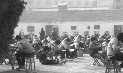 距臺前縣政府1公里之遙的城鎮中學,由于教室不充裕,學生在室外空地上考試。網絡截圖
