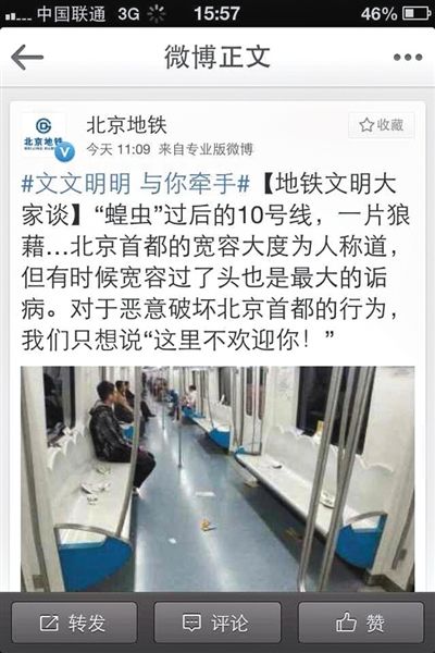 光明網(wǎng)訊(袁晴)昨天,北京地鐵官方微博發(fā)布圖文,稱“‘蝗蟲'過后的10號(hào)線,一片狼藉”,并稱“北京有時(shí)候?qū)捜葸^了頭”,引發(fā)巨大爭(zhēng)議。盡管這條微博隨后被刪除,但卻被網(wǎng)友截屏并加評(píng)論轉(zhuǎn)發(fā)。截至昨日20時(shí),該條微博共有4277條轉(zhuǎn)發(fā),3020條評(píng)論。不少網(wǎng)友認(rèn)為違規(guī)都該被懲罰,但不能歧視。日前,針對(duì)這則微博,北京地鐵運(yùn)營(yíng)回應(yīng)稱,該微博為微博部小編所發(fā)文明乘車的宣傳,未料到其表達(dá)方式引起爭(zhēng)議。北京地鐵運(yùn)營(yíng)表示,目前公司相關(guān)領(lǐng)導(dǎo)已經(jīng)了解情況,待具體處理方案明確后會(huì)及時(shí)告知媒體。