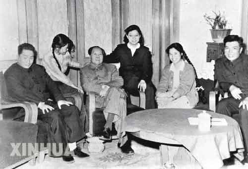 這是1962年春,毛澤東和毛岸青(左一)、邵華(右二)等在一起。(新華社發)