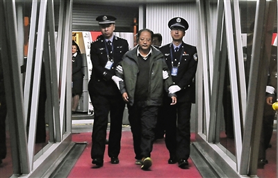昨日,外逃6年的“百名紅通”10號嫌犯裴健強(qiáng)被抓獲歸案。圖為裴健強(qiáng)(中)被執(zhí)法人員帶離北京首都國際機(jī)場。新華社發(fā)