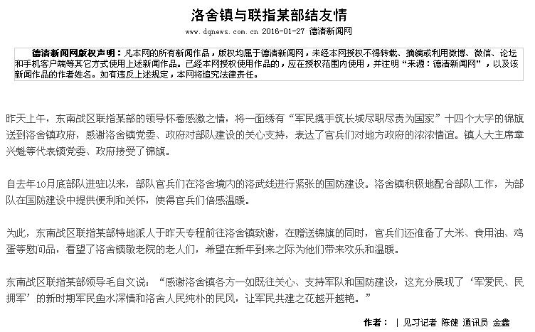 自去年10月底部隊進駐以來,部隊官兵們在洛舍境內的洛武線進行緊張的國防建設。洛舍鎮積極地配合部隊工作,為部隊在國防建設中提供便利和關懷,使得官兵們倍感溫暖。