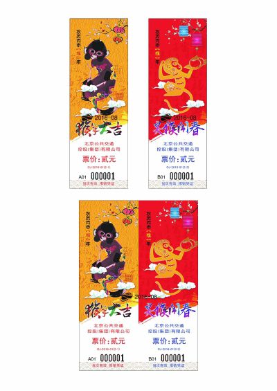 農歷猴年新春到來之際,公交集團于2月1日首班車開始,發行2016年猴年生肖春節紀念車票。紀念車票一套2張,以“猴年大吉”和“靈猴鬧春”為主題,每張票價2元,在北京公交集團所屬有人售票線路上發售。車票與日常公交車普票購買方法一致,乘客上車時按照所乘線路現行票制票價購票,當日當次車有效。持“一卡通”IC卡乘車的乘客與日常刷卡乘車方式一致。紀念票數量有限,售完為止。