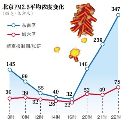 近三年數據顯示,受燃放地點和監測點位距離的影響,北京個別子站除夕夜濃度會達到1000微克/立方米以上的水平,近三年北京的除夕夜都出現了個別子站污染濃度破千的情況。2013年PM2.5濃度峰值出現在除夕凌晨2時,2014年和2015年則出現在凌晨1時。