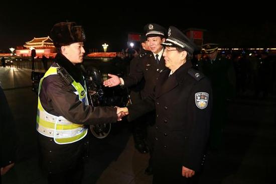 2月7日晚,國(guó)務(wù)委員、公安部部長(zhǎng)郭聲琨深入北京基層公安所隊(duì)和街面執(zhí)勤崗,實(shí)地檢查春節(jié)安保工作。圖為郭聲琨在國(guó)家博物館北門執(zhí)勤崗親切慰問(wèn)執(zhí)勤交警。