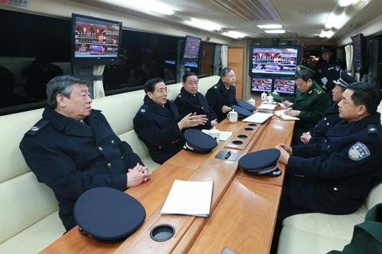 2月7日晚,國(guó)務(wù)委員、公安部部長(zhǎng)郭聲琨深入北京基層公安所隊(duì)和街面執(zhí)勤崗,實(shí)地檢查春節(jié)安保工作。圖為郭聲琨在街面消防指揮車上詳細(xì)詢問(wèn)接處警情況。