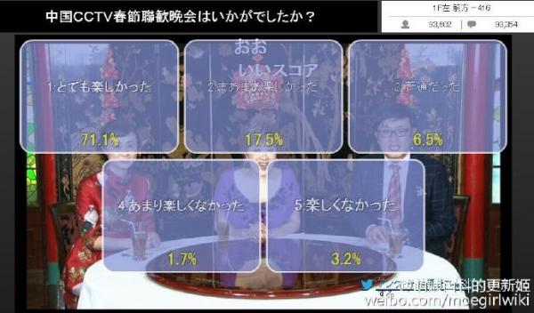 2月7日,在農歷春節來臨之際,央視春晚準時在20:00與全國觀眾見面。作為一年一度的盛會,海外人士又是怎么看待央視春晚的呢?據微博網友@萌娘百科的更新姬 報道,在我們的鄰國日本,有不少人鐘情于央視春晚。在日本的Nico視頻網站上,有71%的日本人認為央視春晚好看。而在國內,各個平臺推出的搶紅包功能一度蓋過了央視春晚的風頭,不僅是年輕人,許多大叔大媽也成了低頭族,吭哧吭哧搶了一晚上的紅包。