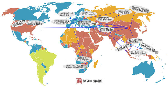 2015年是就習近平任國家主席以來出訪次數最多的一年,他8次踏出國門,登陸亞、歐、美、非四大洲,出訪10個國家,參加9次國際會議,在國外42天時間。在當今世界大發展、大變革、大調整的時代,習近平主席從國內國外兩個大局著眼,基于我國發展仍然處于大有作為的重要戰略機遇期的科學判斷,以和平、發展、合作、共贏的大國外交理念,構建合作共贏新伙伴、打造人類命運共同體,服務和平發展大局、善處利益紛爭亂局、開創共同發展新局,唱響中國聲音、宣示中國主張、貢獻中國智慧,譜寫大國外交新華章。請隨“學習中國”小編一起回顧習主席2015年的外交足跡。