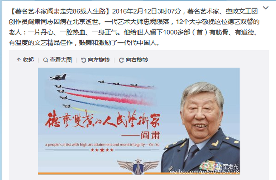 [著名藝術家閻肅走完86載人生路]2016年2月12日3時07分,著名藝術家、空政文工團創作員閻肅同志因病在北京逝世。一代藝術大師忠魂隕落,12個大字敬挽這位德藝雙馨的老人:一片丹心、一腔熱血、一身正氣。他給世人留下1000多部(首)有筋骨、有道德、有溫度的文藝精品佳作,鼓舞和激勵了一代代中國人。