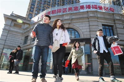 昨日,領完結婚證的新人們走出朝陽區民政局婚姻登記處。新京報記者 尹亞飛 攝