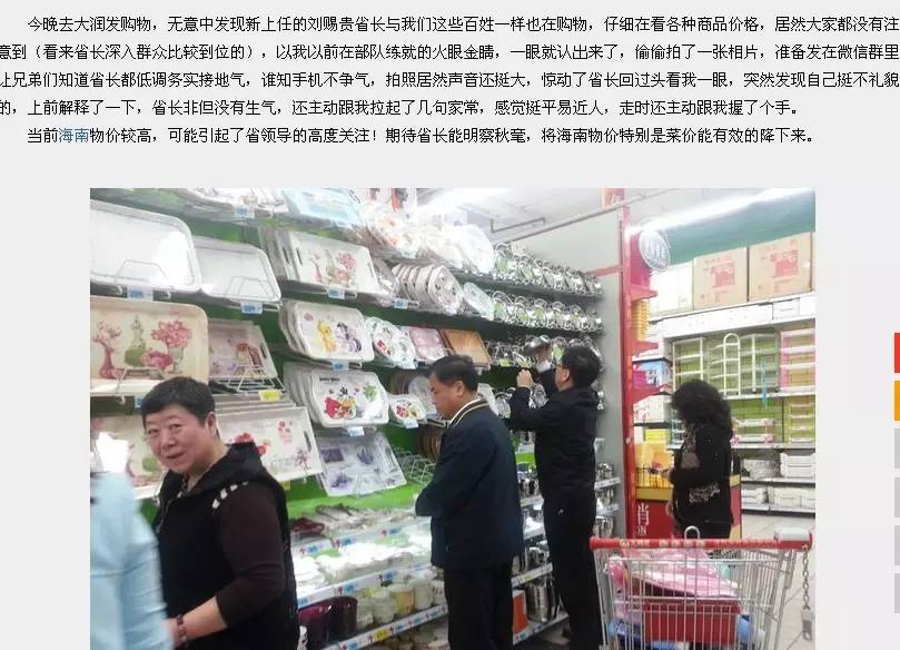 “今晚去大潤發購物,無意中發現新上任的劉賜貴省長與我們這些百姓一樣也在購物,仔細在看各種商品價格,居然大家都沒有注意到……”
