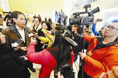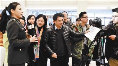 政協(xié)委員梁滿林報(bào)到后,被眾多媒體記者“包圍” 攝影/本報(bào)記者 魏彤
