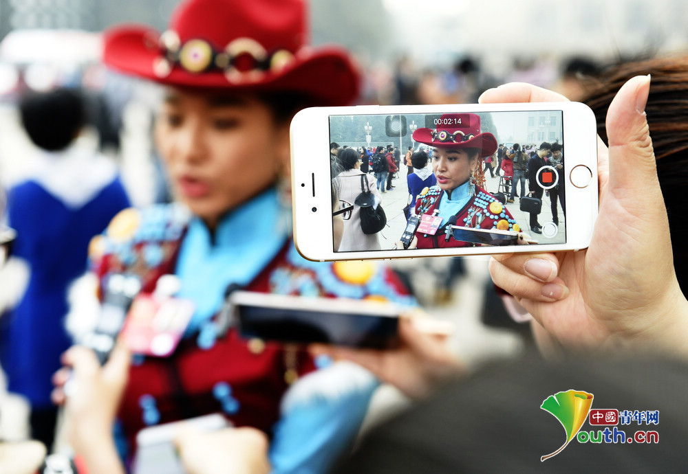 身著民族服飾的全國政協委員接受媒體采訪。人民政協網記者 俞寧攝