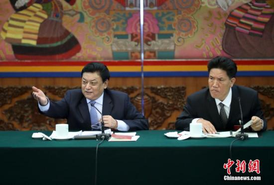 3月7日,出席十二屆全國人大四次會議的西藏代表團舉行全體會議,并對中外媒體開放。全國人大代表、自治區人大常委會主任白瑪赤林(左),全國人大代表、自治區主席洛桑江村回答記者提問。中新社記者 杜洋 攝