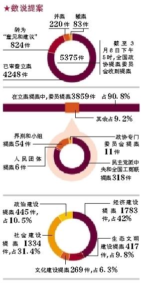 截至3月8日下午5時,共收到提案5375件,提案委員會根據《政協全國委員會提案工作條例》進行了立案審查。經審查,立案4248件,轉為“意見和建議”824件,并案220件,撤案83件。