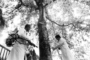 為抑制楊絮,北京市園林科學研究院的工作人員為楊樹“打針”。