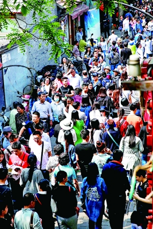 據統(tǒng)計,目前南鑼鼓巷日均客流量超過3萬人次,周末客流量超過5萬人次,節(jié)假日客流量超過了10萬人次。而按照國家旅游局此前公布的《景區(qū)最大承載量核定導則》標準,南鑼鼓巷景區(qū)的瞬時承載量僅為1.7萬人。