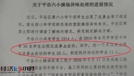 北京平谷區第六小學的校園改造工程,是在2015年10月26日完成招標的,2016年5月工程完工,塑膠跑道鋪設面積1700平方米,從完工到使用,不到10天,學校里就出現部分學生不同程度的流鼻血、過敏、頭暈、惡心等癥狀。