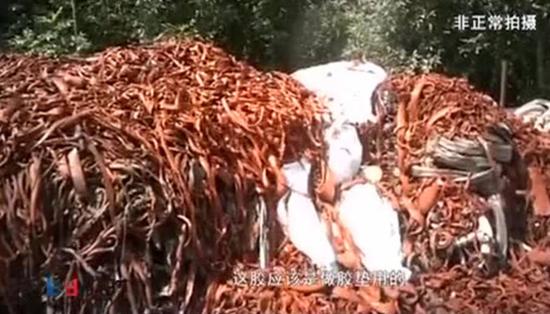 張老板把記者帶進了眼前的這個普通的農村庭院,走進大門,廢棄輪胎、廢棄電纜、還有一些叫不上名字的橡膠制品交織在一起,堆起了一座座小山。張老板告訴記者:就是這些垃圾橡膠制品,打成黑顆粒,就成了跑道最底下的那層配色了。