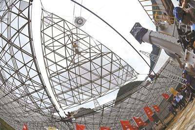7月3日,工作人員在吊裝FAST最后一塊反射面板 供圖/視覺中國