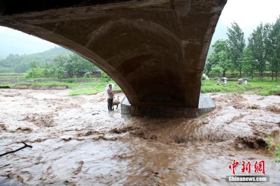 7月19日下午,河南省濟(jì)源市,受強(qiáng)降雨影響,當(dāng)?shù)鼐爬餃虾铀蜐q,一名正在九里溝引沁渠橋下放羊的村民和20多只山羊,被猛漲的洪水困在河道,無法回到岸上。現(xiàn)場,滾滾河水沖擊著橋墩,發(fā)出轟隆隆的響聲,水位還在不斷上漲,情形十分危急。當(dāng)?shù)叵姥杆俪鰟樱诤樗锞热擞志妊颉?古少杰 攝