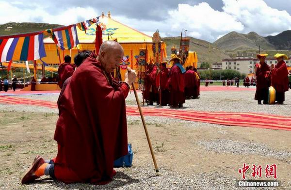 此事發(fā)生在西藏日喀則,說具體點就是班禪時輪金剛灌頂法會現(xiàn)場。7月23日,記者親眼看到,有位老人特別顯眼,他身著的僧袍與周圍藏族僧袍略有不同,不像是藏區(qū)的。中午12點一過,他就跪在班禪大師必經(jīng)之地的黃色蓮花寶毯旁。別人告訴他,班禪為信眾灌頂要到下午兩點才開始,氣溫這么高,趕緊起來,到陰涼處等候,別跪壞了身子。