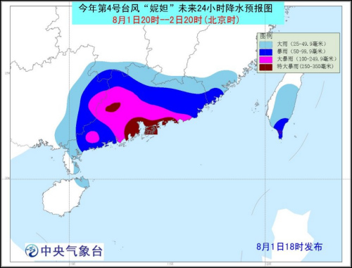 從風力來看,根據預報,8月1日20時至2日20時,南海北部的大部海面、廣東中東部沿海及珠三角地區將有9-12級大風,“妮妲”中心經過的附近海面和地區風力13-15級,陣風可達16級。從降水來看,廣東珠三角及東部沿海地區局地有特大暴雨(250~350毫米)。