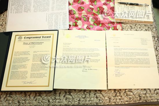 這次與王成漢見面,瑪麗還帶來了一份特殊的禮物。它們是來自美國駐中國大使館的大使馬克斯·西本·鮑克斯(Max Sieben Baucus)和州參議院主席斯蒂芬·斯威尼(Stephen Sweeney)的公告與禮物;一些當年被從濰縣集中營解救出來的難民寫給王先生的感謝信;美國代表唐納德·諾克羅斯(U.S. Rep Donald Norcross)也因王先生的“無私的行為與貢獻”將其姓名寫進了國會記錄。瑪麗將這些信件親手交到王成漢手中,兩位老人戴上老花鏡,認認真真地翻看起來。王成漢用顫抖的手指撫摸著這些信件,忍不住輕輕讀出了聲。