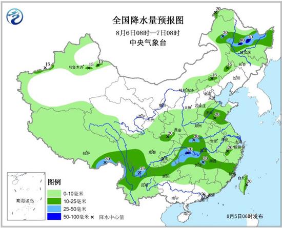 8月6日08時至8月7日08時,內蒙古東北部、黑龍江中部、黃淮東部、江淮西部、江漢、江南北部和 東南部、四川盆地南部、云南北部、貴州中北部等地有中到大雨,其中,黑龍江中部、湖南北部的局地有暴雨(50~80毫米);上述部分地區伴有短時強降水、 雷暴大風或冰雹等強對流天氣。