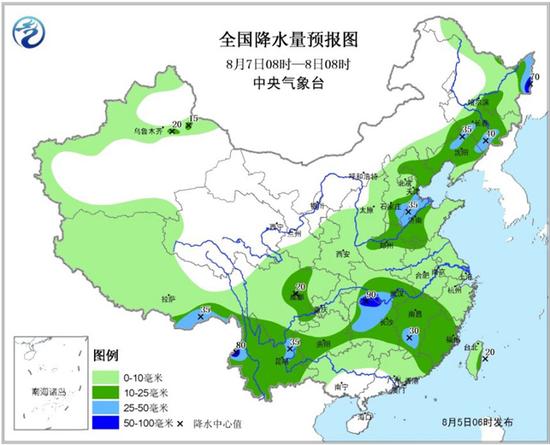 8月7日08時至8月8日08時,東北地區中南部和東北部、華北東部、黃淮北部、江南東南部和西部、 江漢、西南地區南部、西藏東南部等地有中到大雨,其中,黑龍江東北部和湖南北部等地的局地有暴雨(50~90毫米);上述部分地區伴有短時強降水、雷暴大 風或冰雹等強對流天氣。