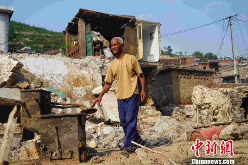 貴泉村位于臺頭村的上游。年屆七旬的貴泉村村民董超渾濁的雙眼布滿了血絲,今年的“7.19”洪災使他失去了兒子一家四口。兒子居住在河道低洼地段,洪水將他兒子家居住的二層樓房全部沖毀,而董超因居住房屋地勢較高幸免于難。